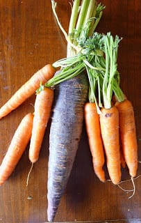 | Purple carrots, if you can get them, are gorgeous as well as delicious. Back in the 18th century, they were probably more common than today. |