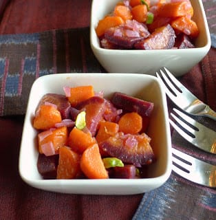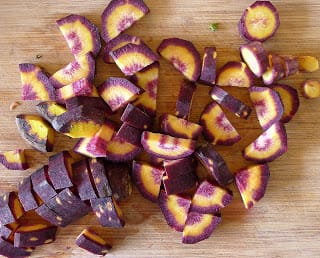 I used half regular carrots and half purple ones. I chose to cut them in thick crosswise slices. The purple carrot was huge, weighing almost 1 pound, so I cut it lengthwise into quarters, then sliced it crosswise. I cooked the orange and purple carrots separately and did not save the liquid from the purple ones. (It made a good stock for making borscht the next day; with beets, the deep color was perfect.)