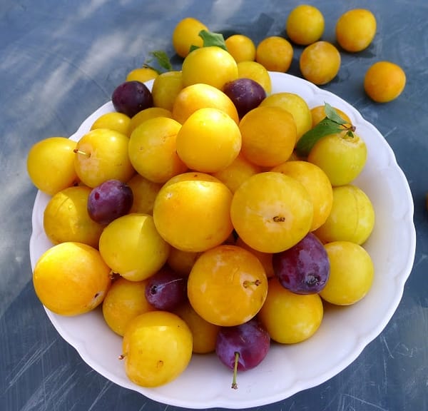 When my grandson Leo arrived to stay with us, he was toting a bag of toys and a bag of golden yellow plums (ciruelas; ciruelas-pasas are prunes), picked on his Nana’s finca (farm). I’ve been enjoying them for breakfast every day. Now I’m branching out—looking for other ways to use them up.