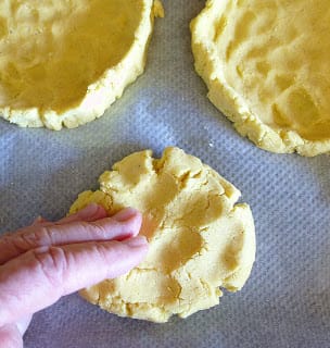 Line a baking sheet with baking parchment. Space the balls of dough on the sheet (use 2 sheets, if necessary). Use fingertips to flatten the balls into 4-inch rounds, about ¼ inch thick. Pinch around the edges to turn up a rim to contain the filling.