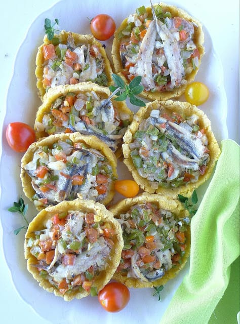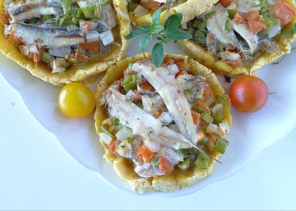 Today I’m making a specialty from the Almería town of Vera, Torticas de Avío, sometimes called Almería “pizza.” It’s a flatbread made of cornmeal, topped with those quintessential Mediterranean ingredients, anchovies, tomatoes, onions and peppers. The topping is flavored with oregano and a good bit of cumin. My only addition to the traditional recipe is capers, which I think add a nice punch. The next time I make the torticas, I might use some wheat flour with the cornmeal. If you can't find fresh anchovies, try using oil-packed ones or even canned sardines.