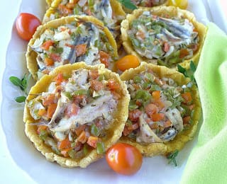 Spoon the anchovy-vegetable mixture into the tart shells. Drizzle the remaining 1 tablespoon of oil over them.
