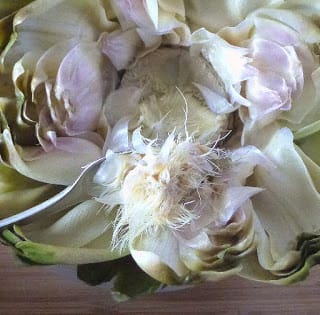 | Use a spoon to scrape out the fuzzy choke - or let each person do it for herself. |