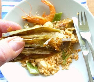 Even when I'm cooking artichokes with other ingredients, such as in this cazuela of rice with fish, I do a minimum of prepping—snap off a few outer leaves, cut the artichokes in quarters and add them right to the oil in the cazuela. Then, it’s hands on. You pick up the artichoke by the inedible leaf tips and bite off the tender heart, discarding the leafy “handle.” Accompany with paper towels for finger wiping.
