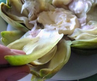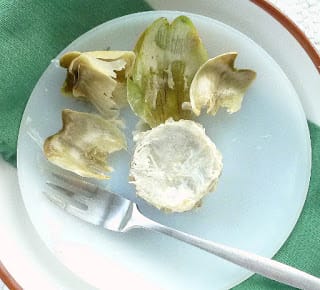 | Pick up the cut artichokes by the tips and bite off the tender heart. Provide paper towels for hand wiping! |