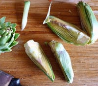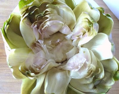 | All the prepping necessary: cut off the stem, snap off a few outer leaves. No lemon juice needed, because inner leaves are not exposed. Drop the whole artichokes into salted boiling water. |