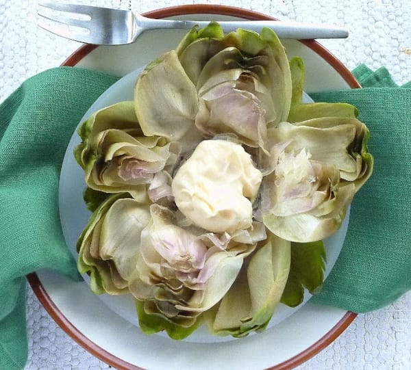 | To eat: pull off a leaf, dip it in mayo and pull the leaf through the teeth to extract the fleshy bit. Discard the leaf. (Yes, you'll need a plate for the leaf debris.) |