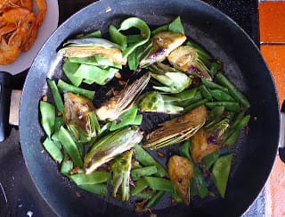 | Sauté the cut artichokes in oil with the beans. |