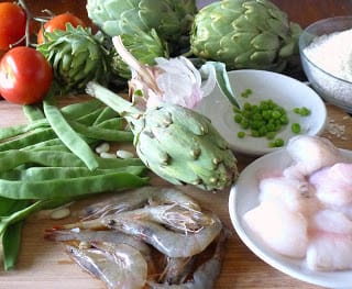 | Savory rice cooks with artichokes and other vegetables and fish. Shrimp garnish the finished dish. |