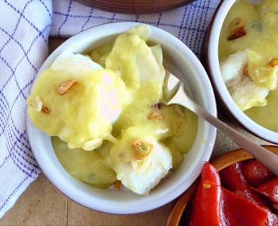 To reheat the cod and sauce, place the cazuela in a cold oven and set the temperature for 300ºF. When oven comes up to temperature, remove the cazuela, swirl in 1 tablespoon water and return to the oven for 5 minutes. Do not overheat or the sauce will separate.