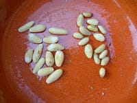 If this looks like manna from heaven, let me hasten to tell you that pine nuts are devilishly difficult to extract. First you have to prise them out of the pine cones (yes, whacking them on the terrace floor helps), then crack each bitsy nut, hopefully without smashing the kernel in the act.