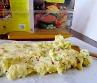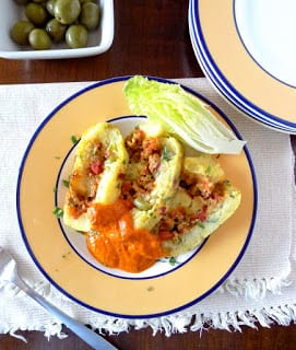 Use mature baking potatoes (such as russets) for this recipe. You can use pimiento-stuffed olives instead of olives plus chopped piquillo peppers. I used the rest of the can of piquillo peppers to make an easy sauce to serve with the roulade (that recipe is here.) Serve the roulade hot, room temperature or cold. It serves 4 as a main course or 6 to 8 as a starter or as part of a buffet meal.
