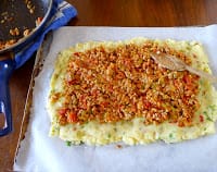 | Spread meat filling on potatoes. |