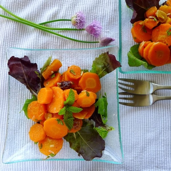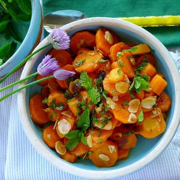 This carrot dish can be served hot, cold or room temperature. It can be prepared and served immediately or left to marinate, refrigerated, overnight. In any case, chop the fresh mint and add to the carrots immediately before serving.