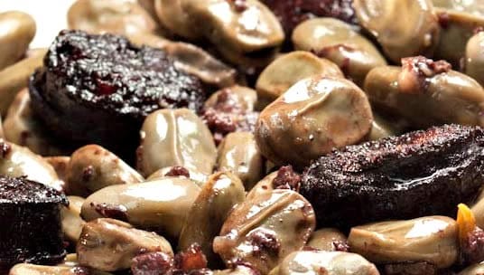 Put a casserole to the fire with the olive oil, and add the fine chopped onions and half of the fresh bacon diced. When it’s gilding, add a part of the Catalan sausage and all the beans, next we add him the white wine and the aromatic herbs, the rest of the bacon and of the Catalan sausage.