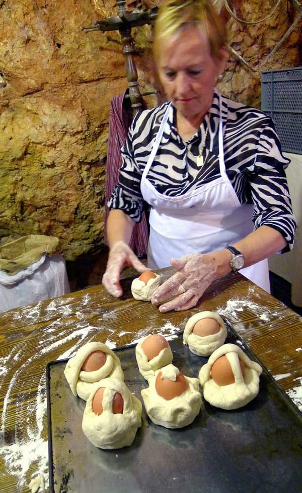 | Each person gets to shape the hornazos. Most are simple little rolls; others are boats, baskets, turtles. In my village, the hornozos are made of basic bread dough with a little matalahúga, aniseed. In other towns, they may have oil or lard, sugar or honey added. |