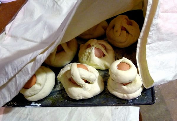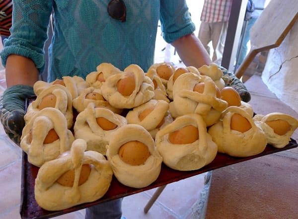 | Hornazos, a typical Easter bread, with egg baked in the dough. |