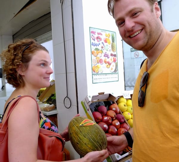 After shopping, we stop at a café in the plaza for segundo desayuno, second breakfast—café con leche (with glasses of ice cubes to cool it down) and pitufo catalan, a toasted bun rubbed with tomato, drizzled with olive oil and topped with ham.