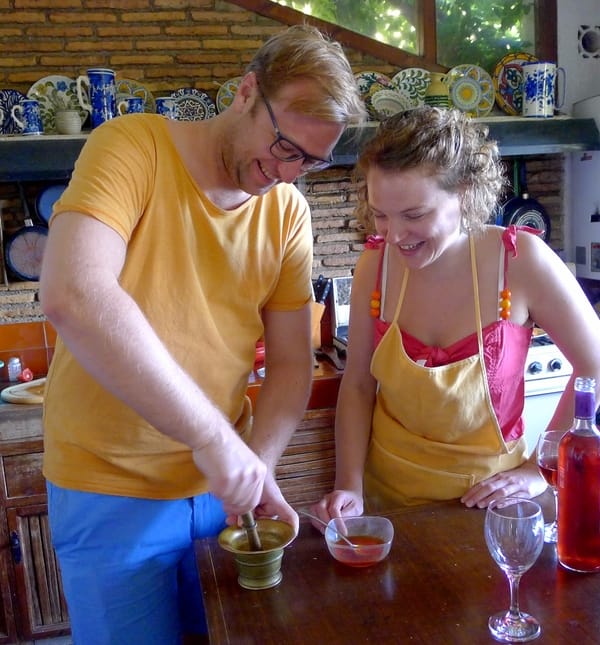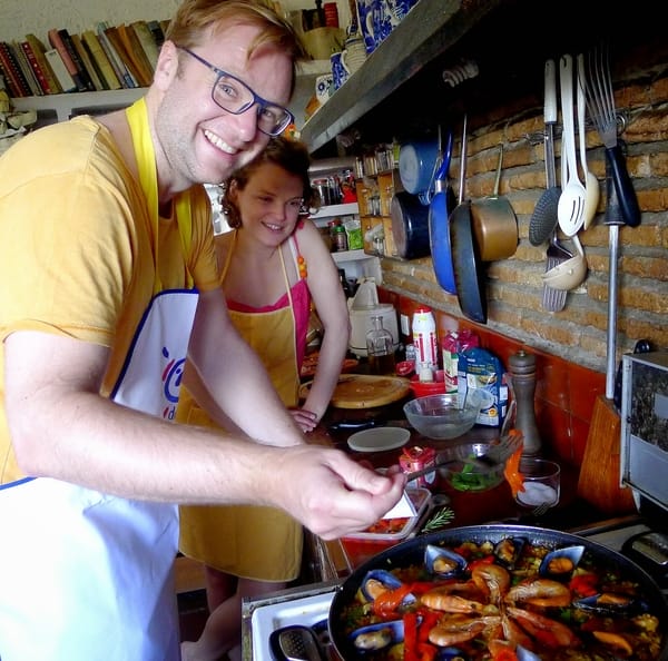 “I’m not so good at cutting,” says Norbert, faced with chopping up peppers and tomatoes for the sofrito, the starting point of paella. Lisa takes over on the chopping detail. A good paella starts with a sofrito, the slow sauteeing of chicken, shellfish, peppers, garlic and tomatoes. Good olive oil is the essential in this process.