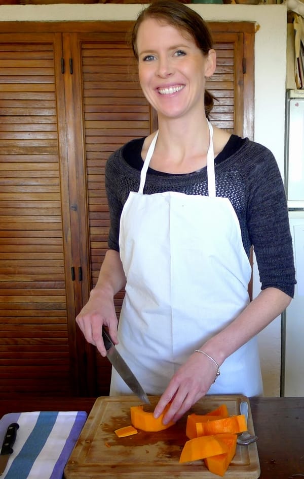 | Hanna chops pumpkin for soup. |