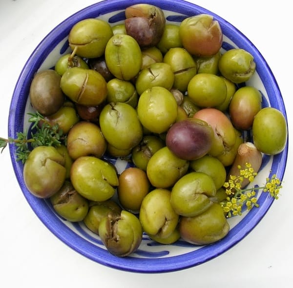 | Home-cured olives with herbs. |