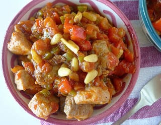 Heat 2 tablespoons of the oil in a cazuela, deep skillet or large saucepan and sauté the pine nuts and garlic until golden, 1 minute. Pat the diced tuna dry and add to the pan. Fry on medium high until lightly browned on all sides, 3 minutes. Skim out the pine nuts, garlic and tuna and reserve.
