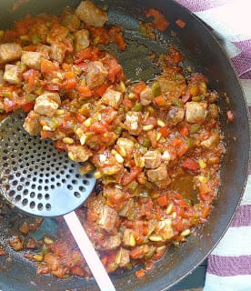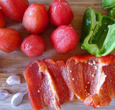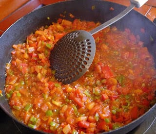 | Basically, the dish is a sofrito of tomatoes, peppers and garlic. |