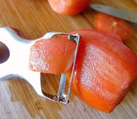 There’s more than one way to skin a tomato! 1.)Drop it into boiling water for 30 seconds, drain, and slip off the skin. 2.)Roast on a grill (wood or gas-fired) just until the skin splits. 3.)Grate the tomato. 4.)Use a vegetable peeler. I can peel a dozen tomatoes with a peeler in the same time it takes to bring a big pot of water to a boil.