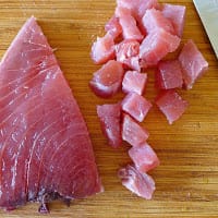 Fresh tuna can be cut into medium dice, unless it will be used for sandwich filling, in which case it needs to be cut up smaller. Canned tuna can be chunked or flaked.