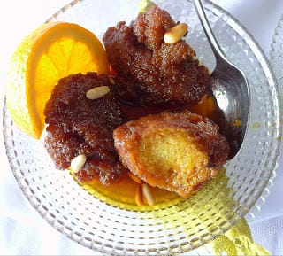 | Puffy dumplings in sweet syrup go nicely with a spoonful of unsweetened yogurt. |