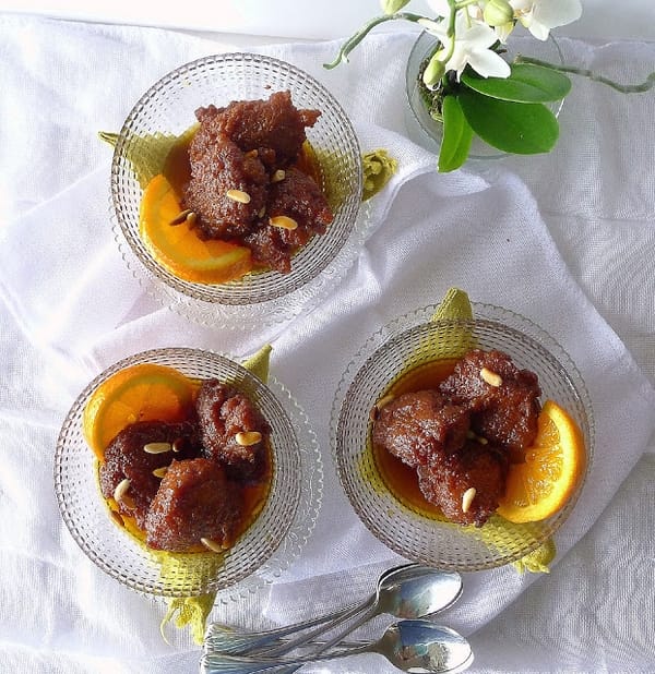 | Dumplings made of bread crumbs are first fried, then poached in caramel syrup with cinnamon. |