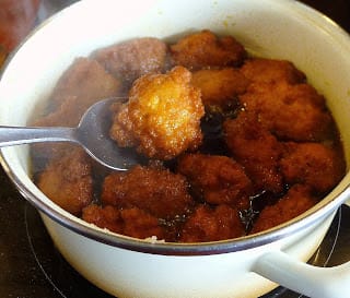 Place oil in a deep skillet to a depth of 1 inch and heat on medium-high. Scoop up dough with a tablespoon. Use a second spoon to smooth the dough into an oval shape and slide it into the hot oil. Continue shaping and frying dumplings, turning them once. When dumplings are golden-brown, remove them. (Dumplings can be fried up to a day before finishing them in the syrup.)