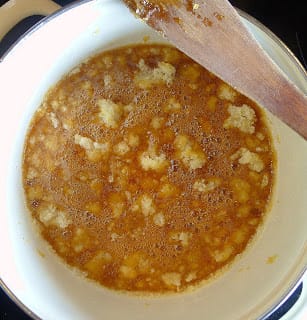 Add hot water to the melted and caramelized sugar very carefully, as it will splutter and foam.