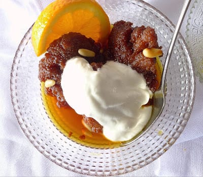 Serve the dumplings chilled, spooning some of the syrup over them. A sprinkling of pine nuts or slivered almonds is typical. Ice cream, whipped cream or—my preference—unsweetened Greek yogurt—makes a lovely accompaniment.