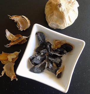 | Black garlic is ordinary garlic that is "aged" in humid conditions, causing a sort of fermentation. Inside the skin, the white cloves soften and turn black. Black garlic has an amazing sweet taste, without the "bite" of fresh garlic. It can be used whole or mashed to a paste. With oil for a baked potato, on pasta or steak. It is sold, peeled, in jars or in whole heads, as shown in the photo. |
