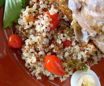 You can use the escabeche marinating liquid to dress the quinoa instead of the oil and vinegar called for in the recipe. You will have more quinoa salad than needed for four servings.