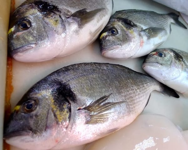 | Farmed fish - gilt-head bream, left; sea bass, right. |