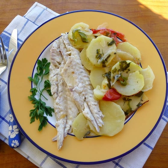 | Baked sea bass with potatoes. |
