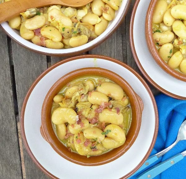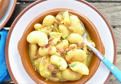 | A sofrito of onions, garlic and serrano ham plus saffron flavors canned butter beans. |