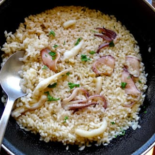 Serve the cuttlefish accompanied by the rice and sprinkled with chopped parsley.