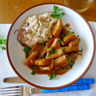| Traditional: Tender cuttlefish in a sauce thickened with fried bread. |