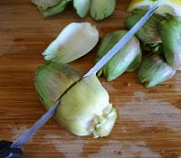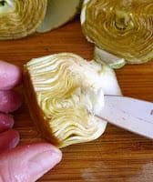 Use the tip of a knife to nip out the fuzzy choke in the center. Rub artichoke pieces with a cut lemon. Add the pieces to the boiling water and cook until the artichoke pieces are just tender, about 10 minutes. (The artichokes are done when an outer leaf pulls off easily.) Drain.