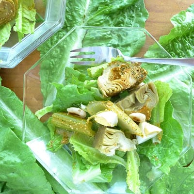 Place the artichokes and celery pieces in a bowl and pour over the dressing. Allow to marinate for one hour at room temperature.
