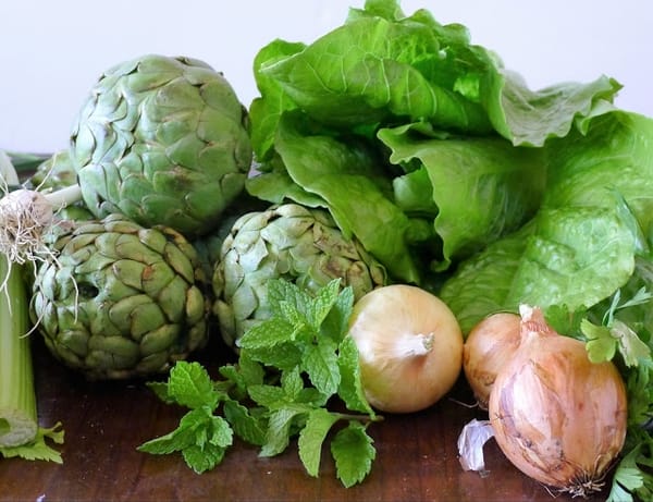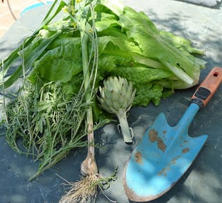 | Today in the garden - green garlic, artichokes, arugula and romaine. |