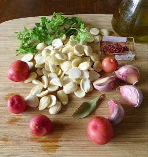 I have a recipe for a very old-fashioned potato dish called “ajopollo.” Ajopollo literally means “garlic-chicken.” But there is absolutely no chicken in the preparation! Garlic, yes. The name possibly derives from el tiempo de hambre, the times of hunger, when an ama de casa had to feed a family on subsistence foods.