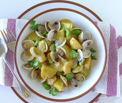 | Clams and a few fava beans turn potatoes into a more substantial dish. |