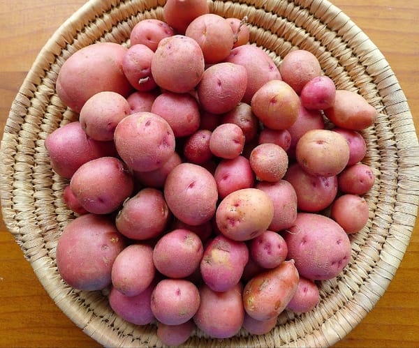 My potato harvest this spring is pretty puny. The biggest spuds are golf-ball sized. Most are more like marbles. I’m glad they are not the only thing that keeps me from famine! Still, they deserve some celebration.