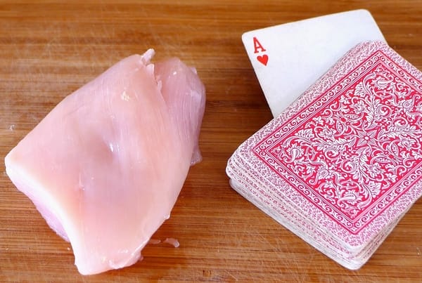 | 100 grams chicken = deck of cards. |
