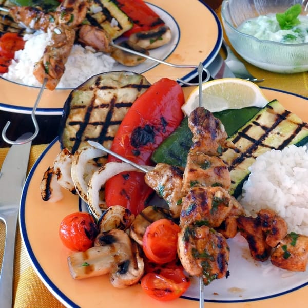 | Spicy chicken kebabs, grilled veggies and rice. |