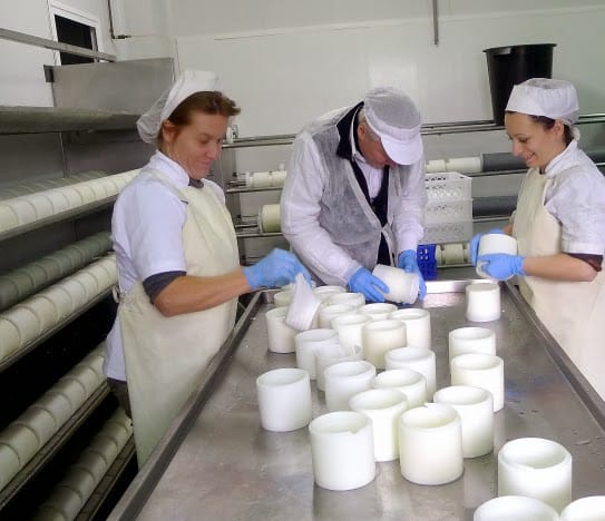 Pepi and her helper pack the curds into cheese-cloth-lined two-part plastic molds. The molds show a crosshatch pattern that mimics the woven esparto grass strips that were used in traditional cheese making. The molds are mounted on a horizontal press and squeezed to release further liquid.